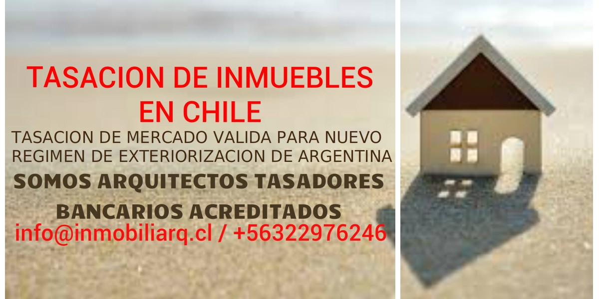 Somos una oficina de Tasaciones ubicada en la ciudad de Viña del mar, con Arquitectos Tasadores Bancarios acreditados, la cual ofrece el servicio de tasacion de inmuebles en la V region de Chile a propietarios argentinos que quieran acogerse al nuevo régimen de exteriorización de bienes raices en vigencia hasta el próximo 31 de marzo de 2017.
