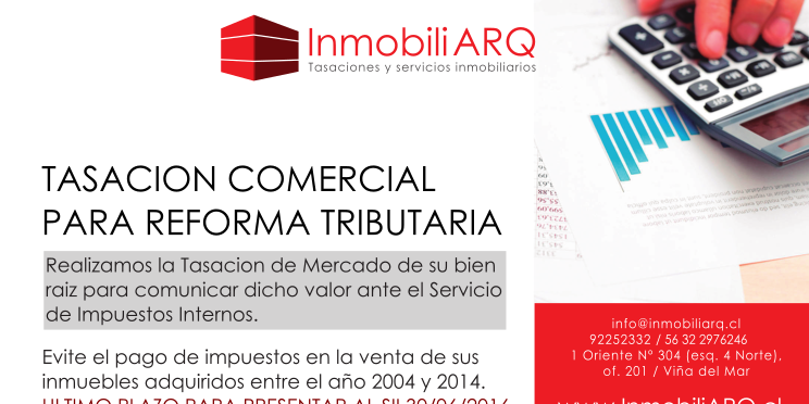 Informamos que ya se encuentra habilitado en Impuestos internos el sistema para comunicar tasaciones a valor de mercado a fin de evitar el pago de impuestos al momento de la eventual venta de alguna de sus propiedades usadas con posterioridad al 01/01/2017. Beneficio que rige para inmuebles adquiridos entre el año 2004 y 2014, esta extensión de plazo estará vigente solo hasta el 30 de Junio del 2016.